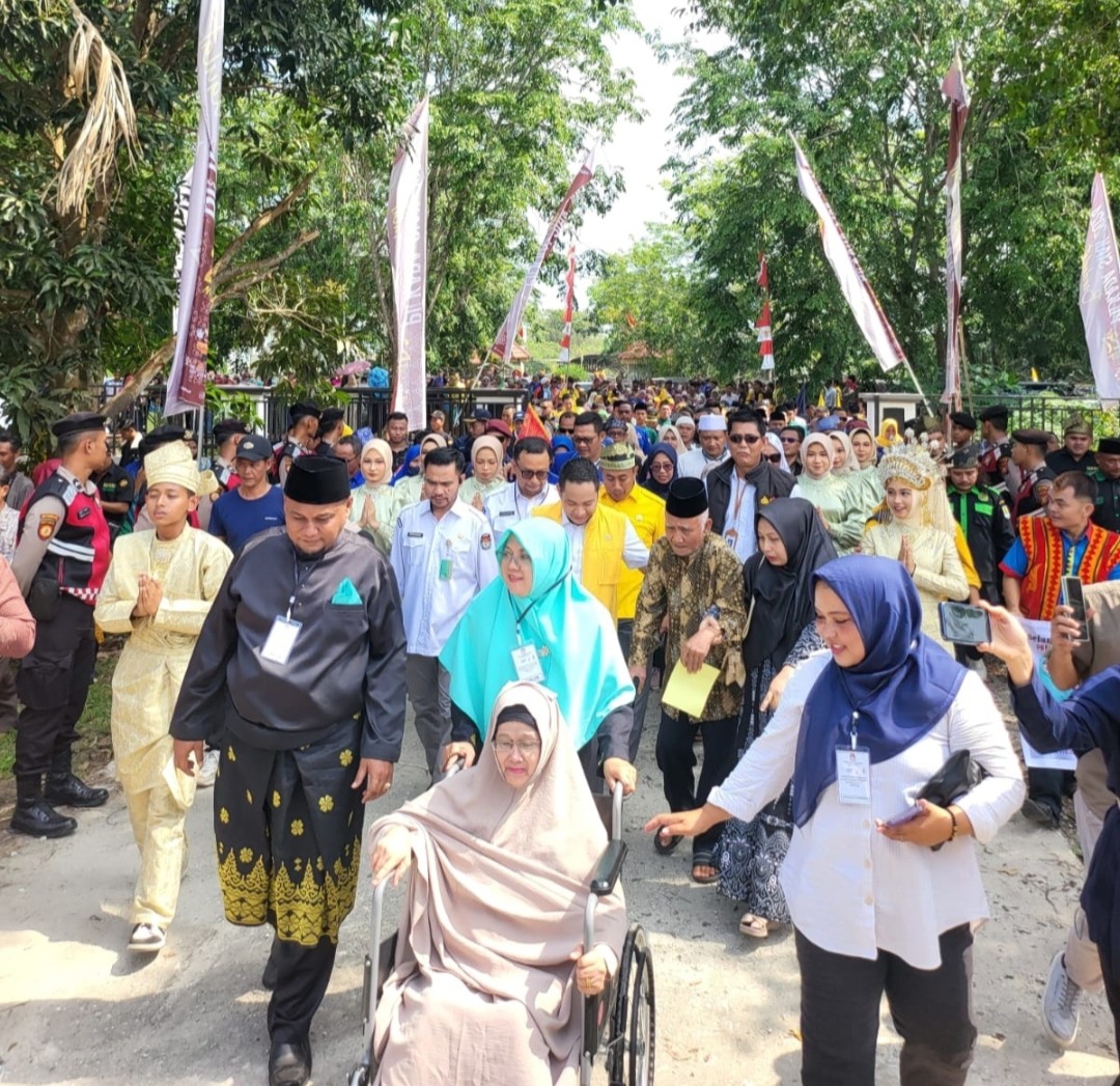 Keterangan Gambar : Pasangan Calon Bupati dan Wakil Bupati Siak Afni - Syamsurizal menuju KPU diiringi ribuan masyarakat, terlihat Calon Bupati Afni mendorong kursi roda Ibundanya, Kamis (29/08/2024)