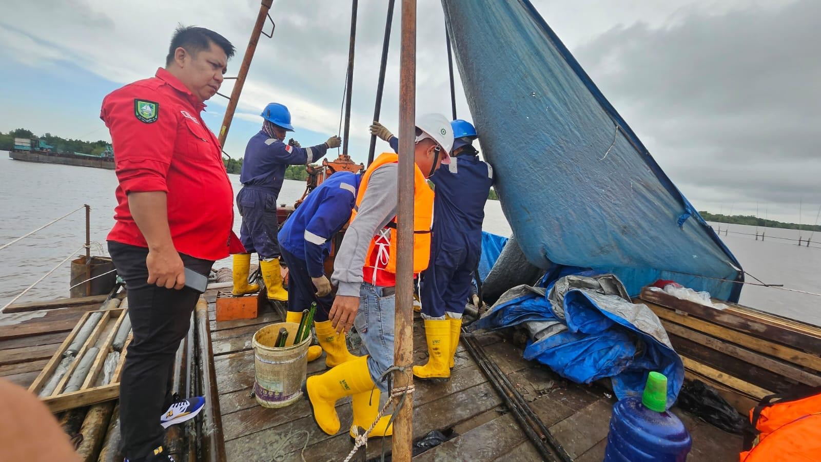 Keterangan Gambar : Sekretaris Dinas PUPR Bengkalis Erdilla memantau langsung progres pekerjaan pengeboran Basic Desain Jembatan Bengkalis - Sumatera di laut Desa Pangkalan Batang Barat, Kamis (7/11/2024).