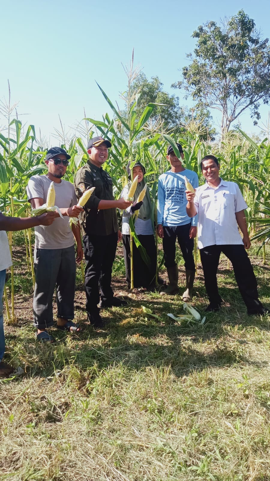 Keterangan Gambar : Pj Kepala Desa Pakning Asal Rizki Subagia Effendi dan perangkat panen Jagung bersama kelompok tani moril di Dusun Pakning Asal Desa Pakning Asal.