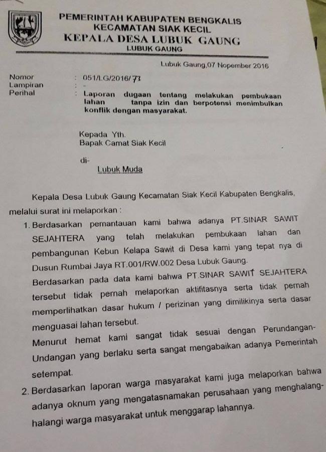 “Adapun beberapa item yang kita laporkan antara lain bahwa PT SSS diduga melakukan pembukaan lahan tanpa izin dan melakukan penguasaan atas tanah di Desa Lubuk Gaung tanpa sepengetahuan Pemerintah Desa, ada oknum dari pihak PT SSS yang menghalang-halangi masyarakat untuk menggarap lahannya, dan Pemerintah Lubuk Gaung meminta Pemkab Bengkalis untuk menindaklanjuti laporan itu serta menyelesaikan sengketa lahan tersebut sebelum terjadi konflik yang lebih meluas,†ungkapnya.