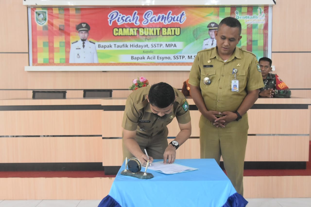 BUKITBATU- Pemerintah Kecamatan Bukit Batu menggelar acara pisah sambut dan serah terima jabatan dari Bapak Taufik Hidayat, SSTP. MPA kepada Bapak Acil Esyno, SSTP. M.Si sebagai Camat yang baru, bertempat di Aula Kantor Kecamatan, Selasa (5/04/2022).