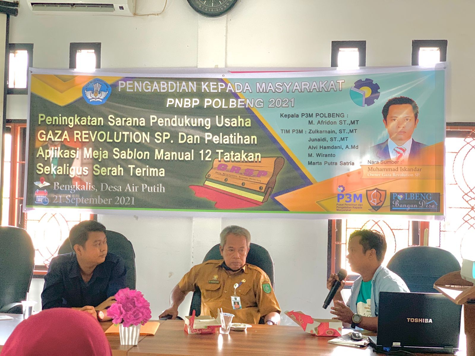 BENGKALIS - Politeknik Negeri Bengkalis (Polneng) menggelar serah terima satu unit meja sablon manual rell 12 palet, sekaligus pelatihan aplikasi meja sablon reel 12 palet yang dilakasanakan di aula kantor Desa Air Putih, Bengkalis pada hari selasa, 21 September 2021 kemarin.