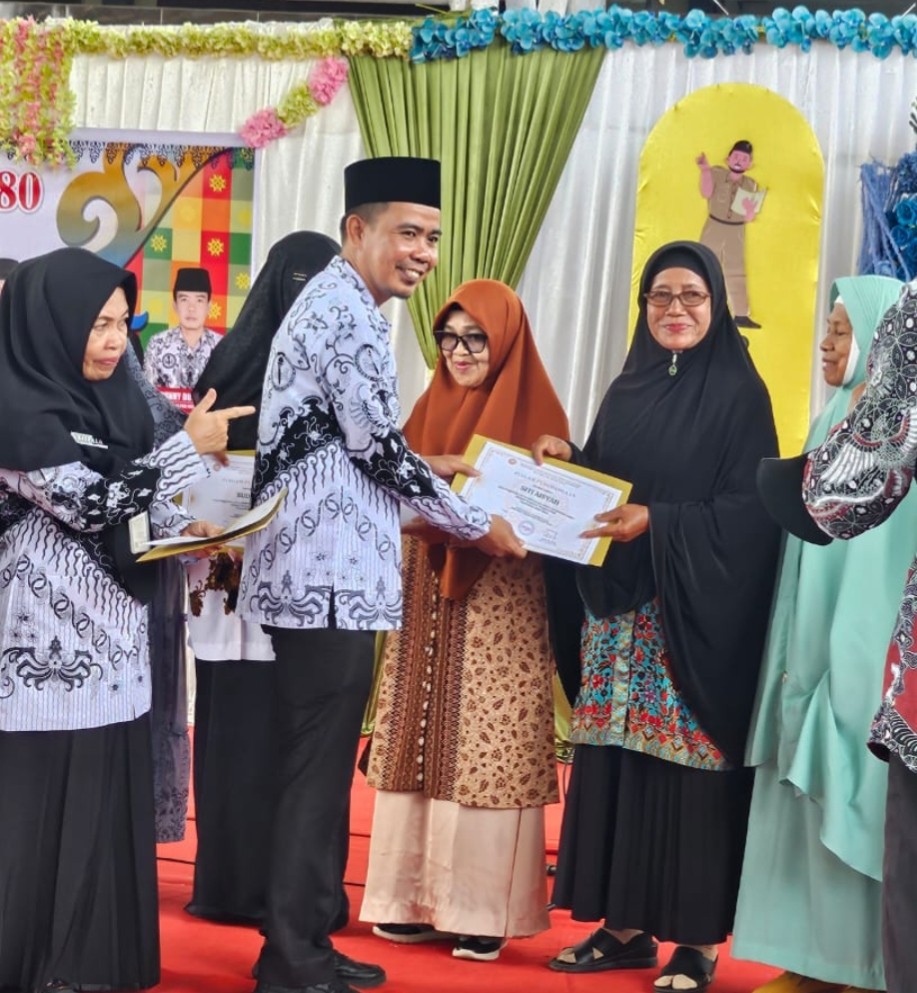 Keterangan Gambar : Korwil Disdik Kecamatan Bukit Batu dan Bandar Laksamana Dunny memberikan penghargaan kepada para guru yang berjasa di Negeri Laksamana, Kamis (27/11/2025).