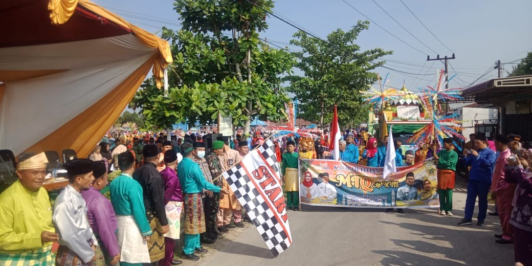 PINGGIR - Ribuan peserta pawai pawai ta'aruf Musabaqah Tilawatil Quran (MTQ) Ke-XVIII Tingkat Kecamatan Pinggir Tahun 2022. Pawai ini langsung dilepas Oleh Plt Camat Pinggir, Zama Riko Dakanahay dengan mengibarkan bendera MTQ dan didampingi oleh anggota DPRD Bengkalis, Azmi dan upika kecamatan.