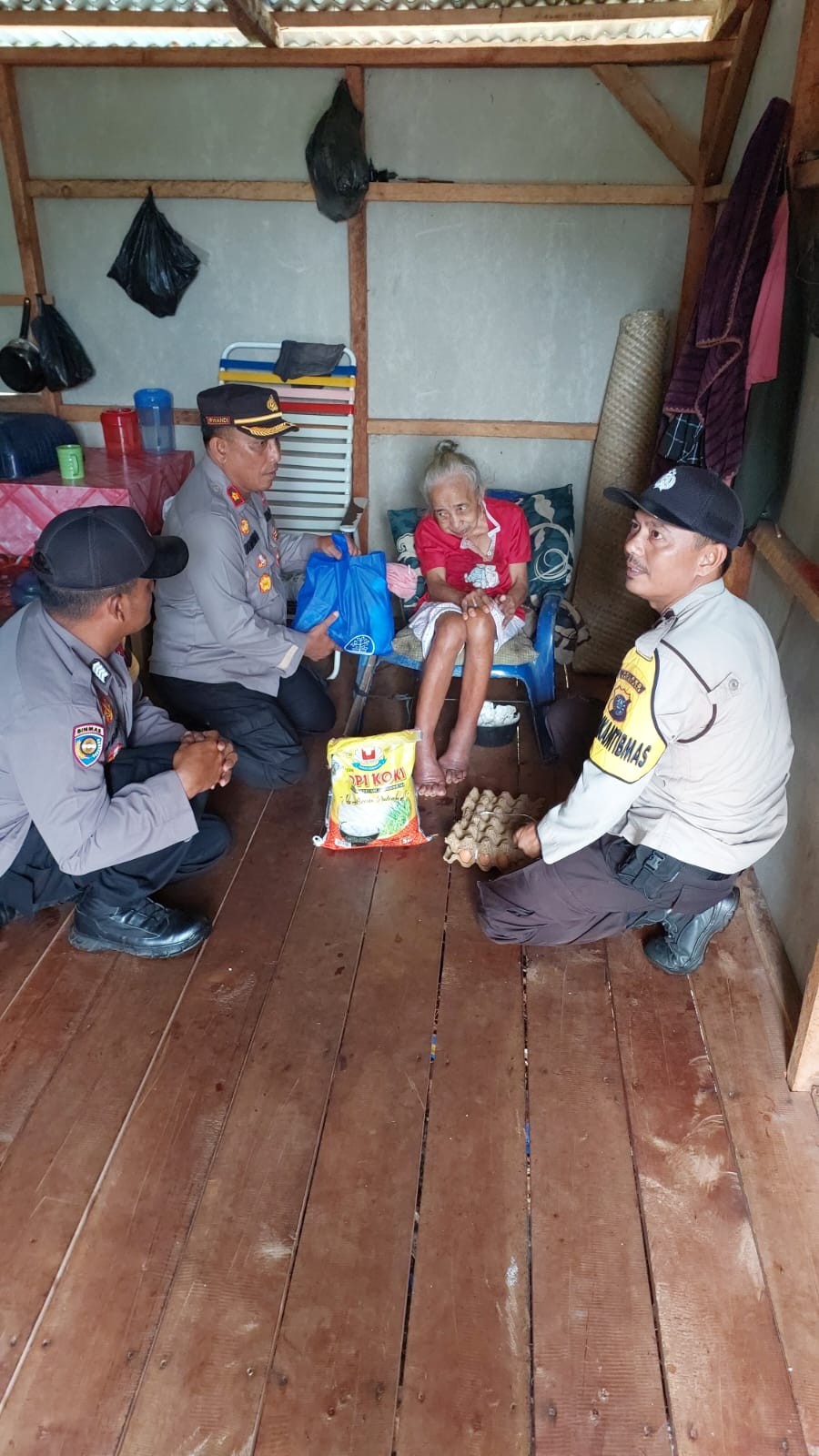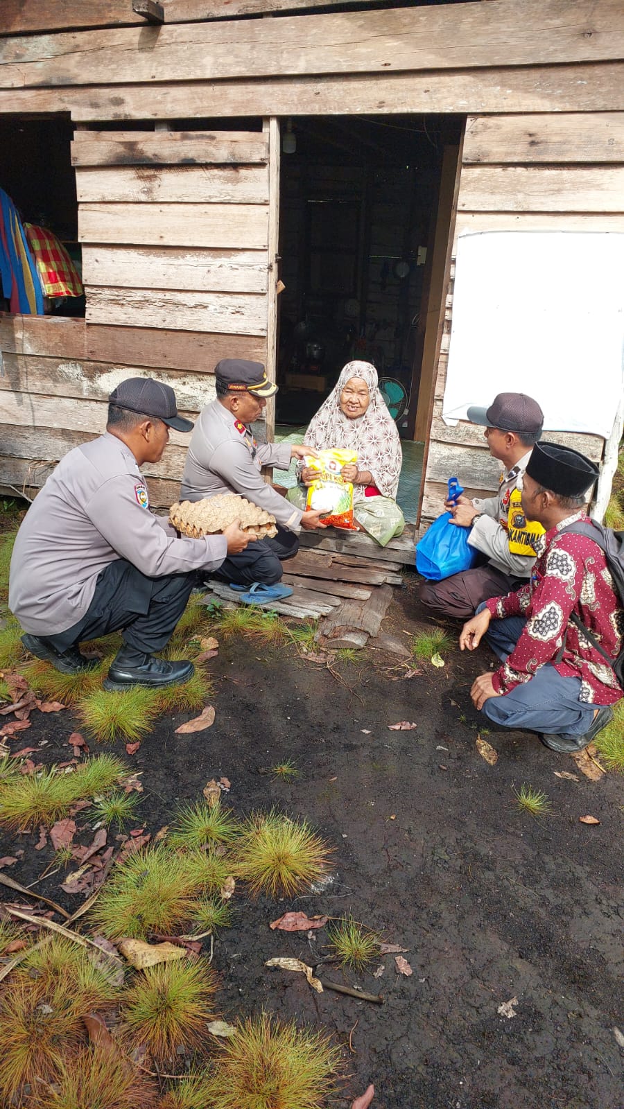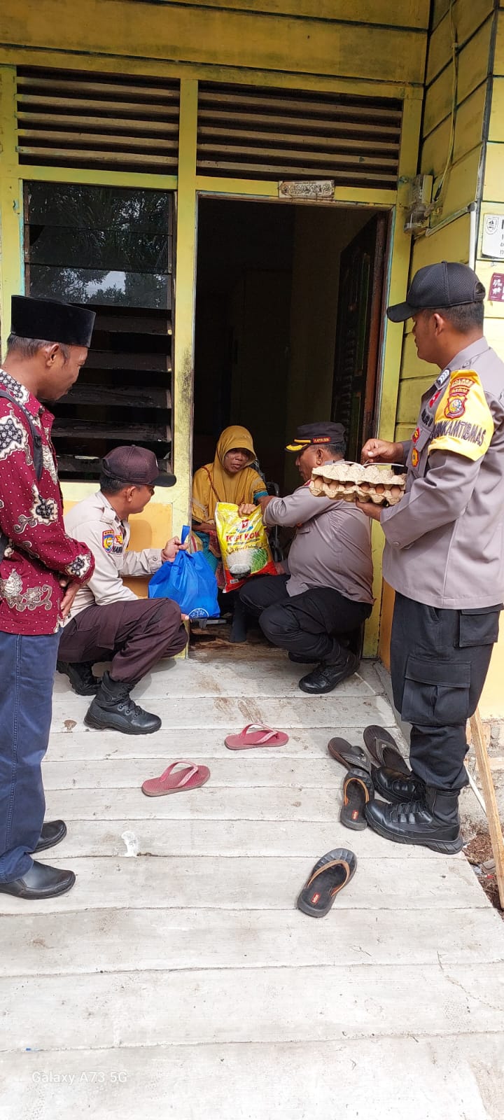 Keterangan Gambar : Kapolsek Bukit Batu Kompol Irwandi dan jajaran saat memberikan bantuan sembako kepada warga kurang mampu Desa Pakning Asal