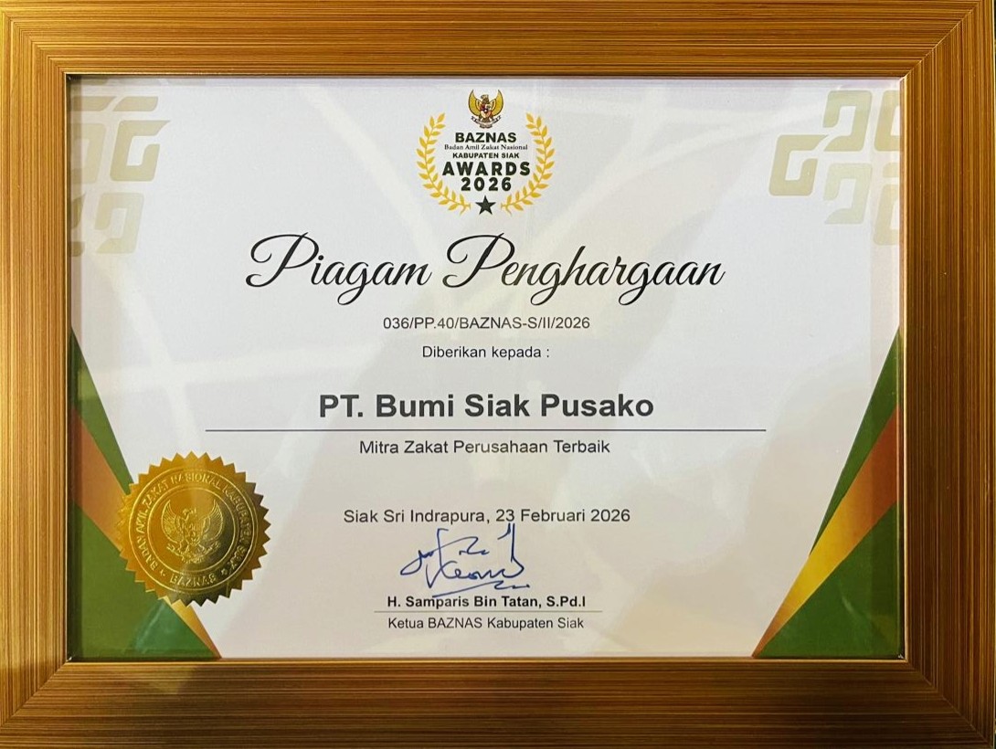 SIAK – Semangat berzakat karyawan PT Bumi Siak Pusako (BSP) menunjukkan tren positif. Hal ini ditandai dengan meningkatnya jumlah zakat yang dihimpun sepanjang tahun 2026 sekaligus mengantarkan perusahaan tersebut meraih penghargaan sebagai Mitra Zakat Perusahaan Terbaik dari Badan Amil Zakat Nasional Kabupaten Siak.