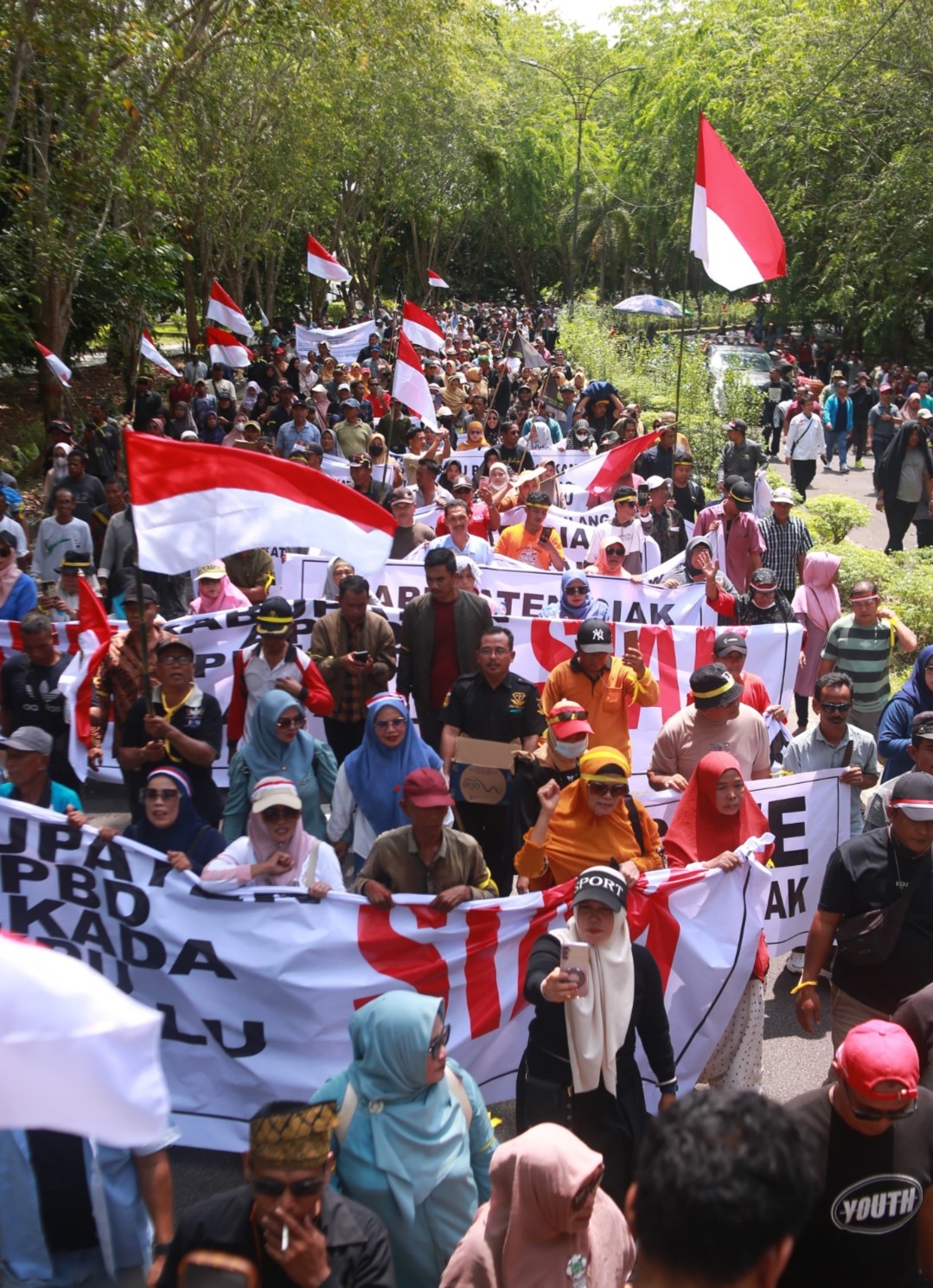 Ribuan massa yang tergabung dalam aliansi masyarakat Siak tersebut berkumpul di Masjid Islamic Siak untuk melakukan doa bersama dan beraholawat sebelum berjalan menuju Kantor KPU dan Bawaslu, tak kenal terik matahari, Ribuan masyarakat bersemangat menyerukan keadilan.