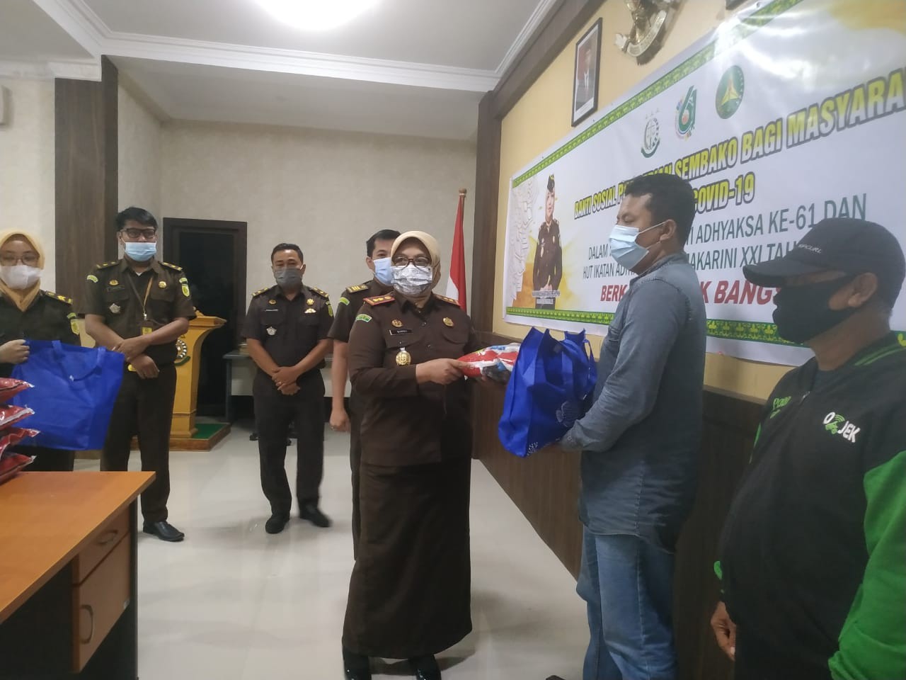 Sebelum membagikan sembako secara simbolis kepada warga, Kepala Kejaksaan Nanik Khushartanti dan pejabat di lingkungan Kejaksaan lebih dulu mengikuti rapat secara virtual dengan Kejaksaan Agung RI.