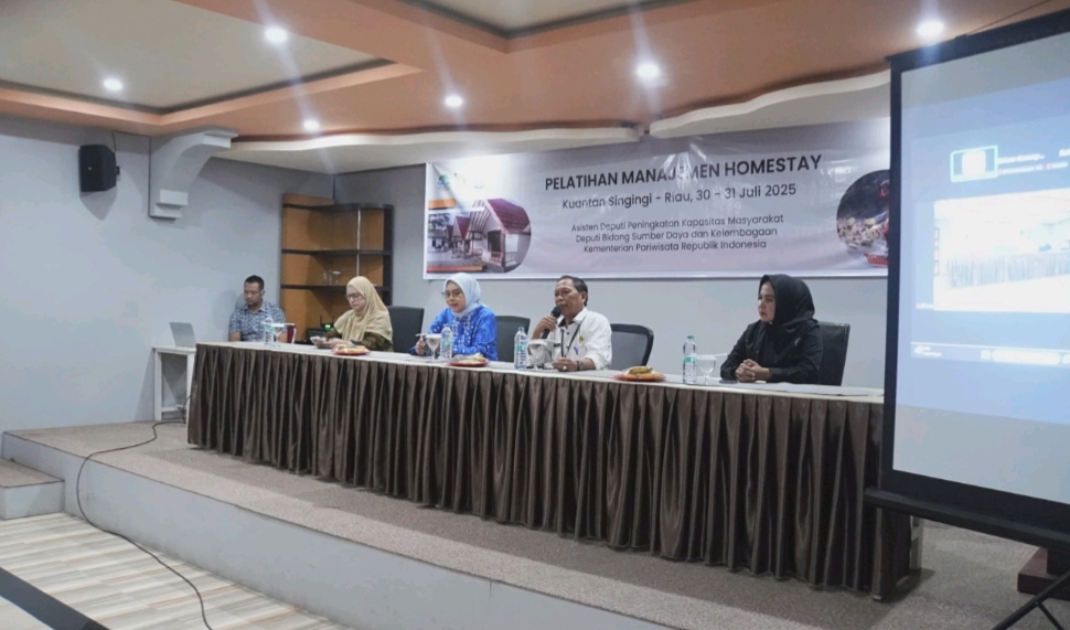 KUANTAN SINGINGI — Dalam rangka menyambut Festival Pacu Jalur 2025, Kementerian Pariwisata (Kemenpar) melalui Deputi Bidang Sumber Daya dan Kelembagaan menggandeng Dinas Pariwisata Provinsi Riau menyelenggarakan Pelatihan Manajemen Homestay bagi 50 pengelola homestay se-Kabupaten Kuantan Singingi. Kegiatan berlangsung selama dua hari, 30–31 Juli 2025, di Hotel Anggela, Teluk Kuantan.