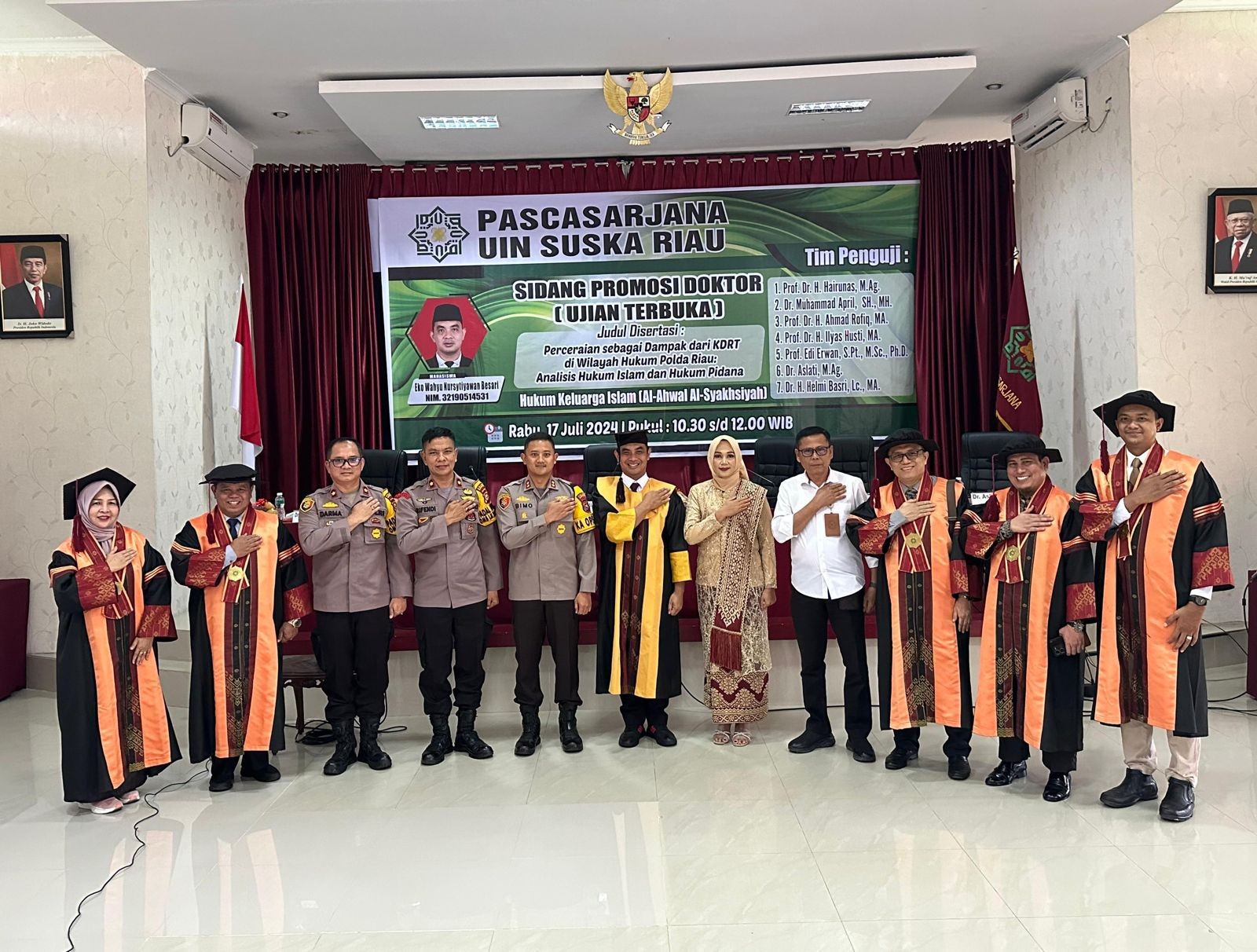 Ujian disertasi yang diselenggarakan secara terbuka, di Aula Gedung Pasca Sarjana UIN SUSKA , Rabu (17/07/2024), Kapolsek tersebut dinyatakan lulus dan berhak menerima sertifikat pernyataan kelulusan.