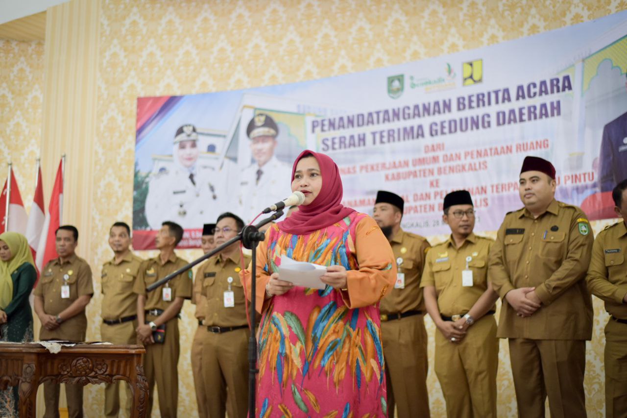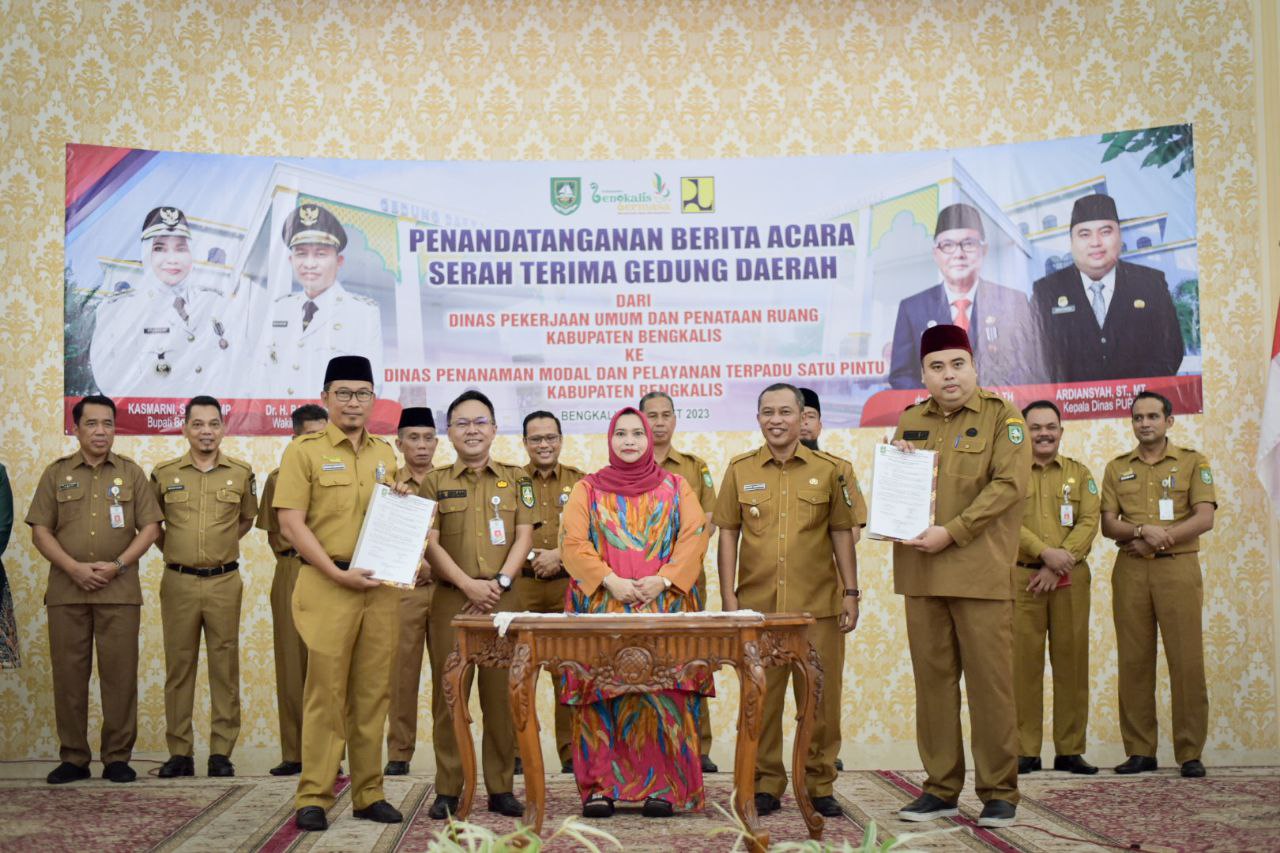 BENGKALIS, - Bupati Bengkalis, Kasmarni bersama Wakil Bupati Dr. H. Bagus Santoso, hari ini, menyaksikan serah terima Gedung Daerah / Mall Pelayanan Publik, dari Dinas Pekerjaan Umum dan Penataan Ruang ke Dinas Penanaman Modal dan Pelayanan Terpadu Satu Pintu Kabupaten Bengkalis di Gedung Daerah Bengkalis, Selasa (28/3/2023).