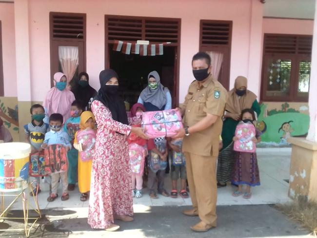 SUNGAI PAKNING- Sisihkan rezekinya, Kepala Desa Pangkalan Jambi Kecamatan Bukit Batu Kabupaten Bengkalis Novri Jefrika memberikan bantuan 28 unit Tas Sekolah secara gratis ke PAUD Harapan Bunda.