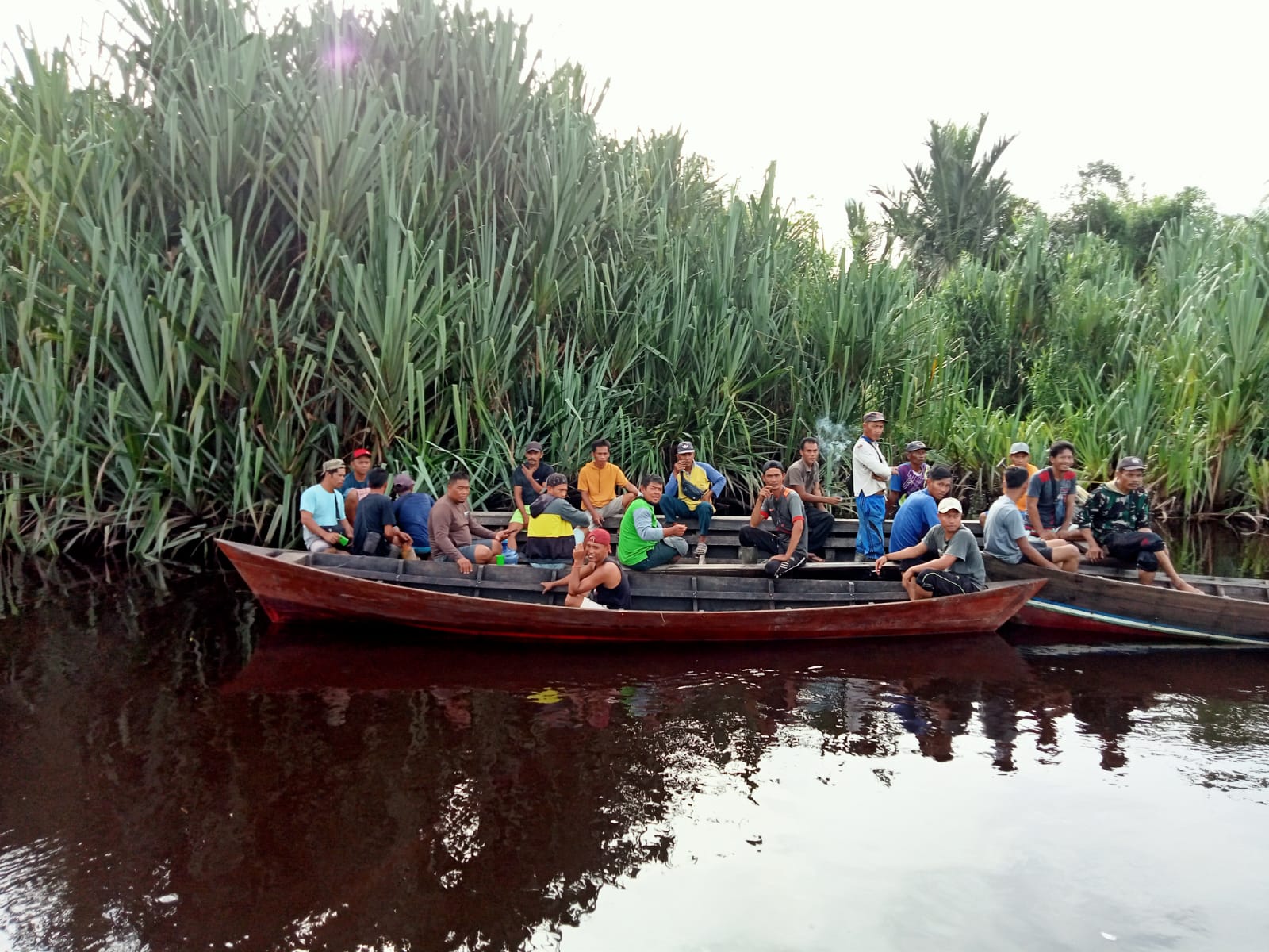 Fakhrudin menaiki sampan itu bersama Riswan (32), Kamisri (30), dan Ramzi (28). Mereka bekerja melangsir buah sawit dari kebun milik Haji Wawan.