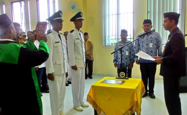 Keterangan Gambar : Camat Bukit Batu Reza Noverindra mengambil sumpah Pj Kades Pakning Asal Hamdani dan Pj Kades Batang Duku Dodi Sandra, Selasa (29/11/2016) lalu.
