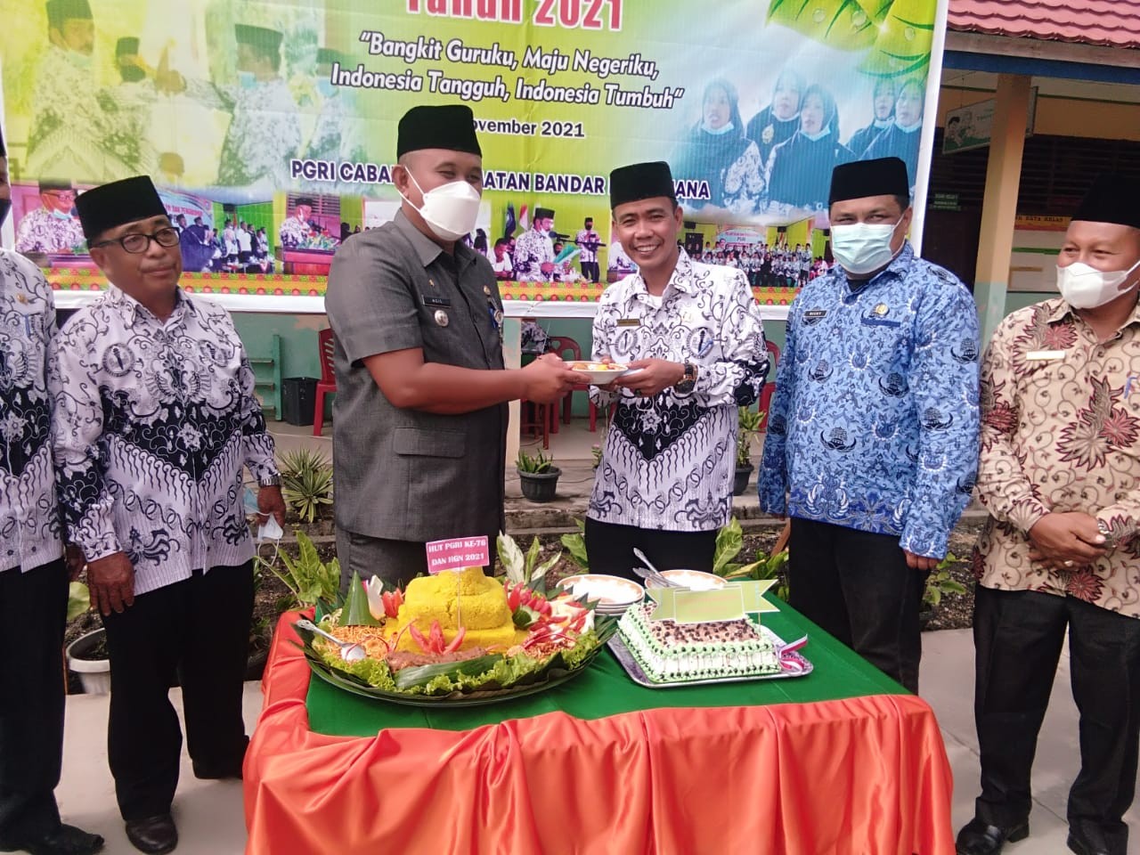Acara juga diwarnai dengan pemotongan nasi tumpeng dan kue ulang tahun, yang disiapkan oleh pengurus PGRI kecamatan Bandar Laksamana.