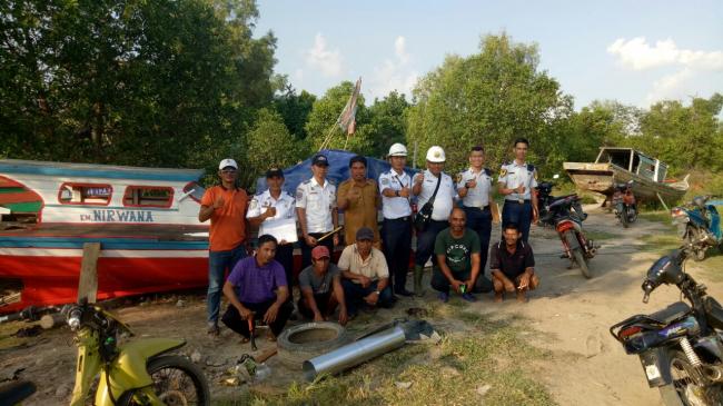 Keterangan Gambar : Terlihat Pegawai KSOP Sungai Pakning Di Dampingi Kepala Desa Foto Bersama usai Verifikasi atau pengukuran ulang Kapal Nelayan