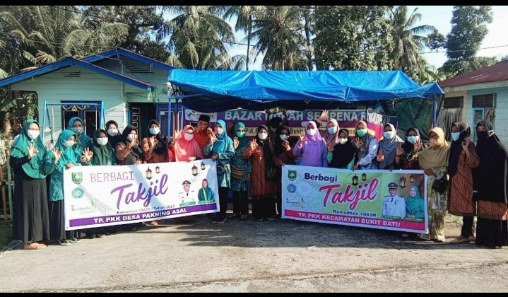 BUKITBATU- Tim Penggerak PKK Kecamatan Bukit Batu bersama TP- PKK Desa Pakning Asal membagikan takjil gratis terutama kepada warga lansia, kaum dhuafa, dan anak yatim piatu.