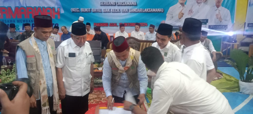 Acara dilanjutkan dengan penandatanganan SK Relawan Mewah oleh Calon Gubernur Riau Abdul Wahid dan Ketua Koalisi Bermarwah Kabupaten Bengkalis Irmi Syakip Arsalan yang disaksikan oleh Tuan Guru Ustadz Abdul Somad, Ketua Tim Pemenangan Arwin AS, Pembina Relawan Mewah Asep Setiawan, tokoh paguyuban, tokoh masyarakat, tokoh agama serta relawan dan warga yang hadir dalam acara tersebut.(Win)