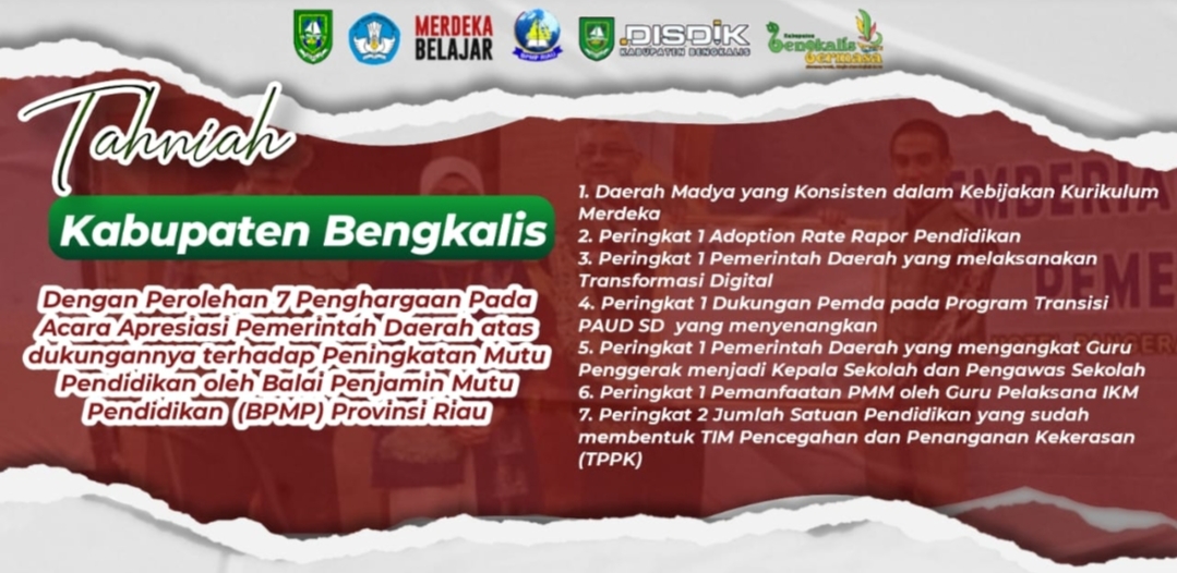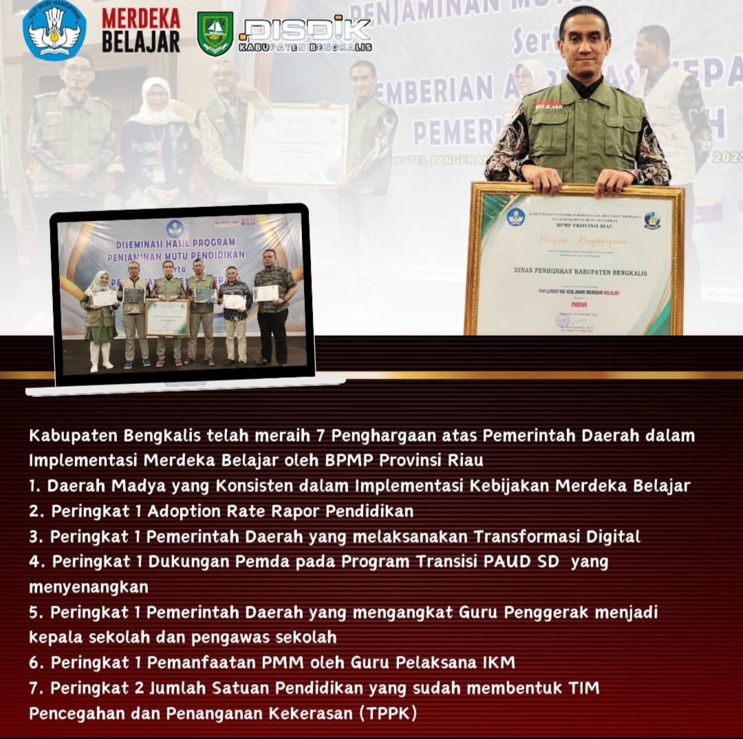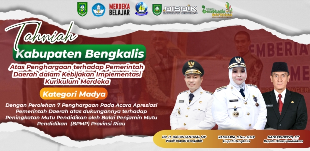 BENGKALIS - Sepanjang 2023, Dinas Pendidikan (Disdik) Kabupaten Bengkalis dinilai sebagai institusi yang paling peduli terhadap implementasi Kebijakan Merdeka Belajar.