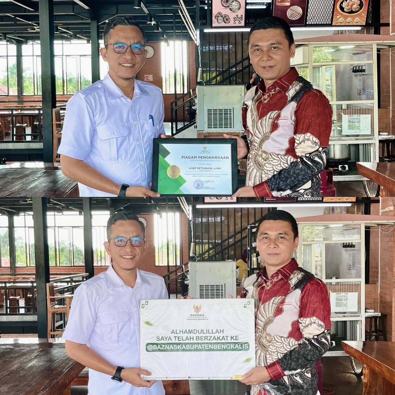 Dalam pertemuan tersebut, Risman Hambali, M.E., Wakil Ketua I BAZNAS Kabupaten Bengkalis, secara simbolis menyerahkan Sertifikat Penghargaan sebagai Muzaki Aktif beserta Kartu NPWZ (Nomor Pokok Wajib Zakat) kepada Asep Setiawan. Penghargaan ini diberikan sebagai bentuk pengakuan atas konsistensi dan komitmennya dalam menyalurkan zakat penghasilannya melalui institusi zakat yang diakui pemerintah.