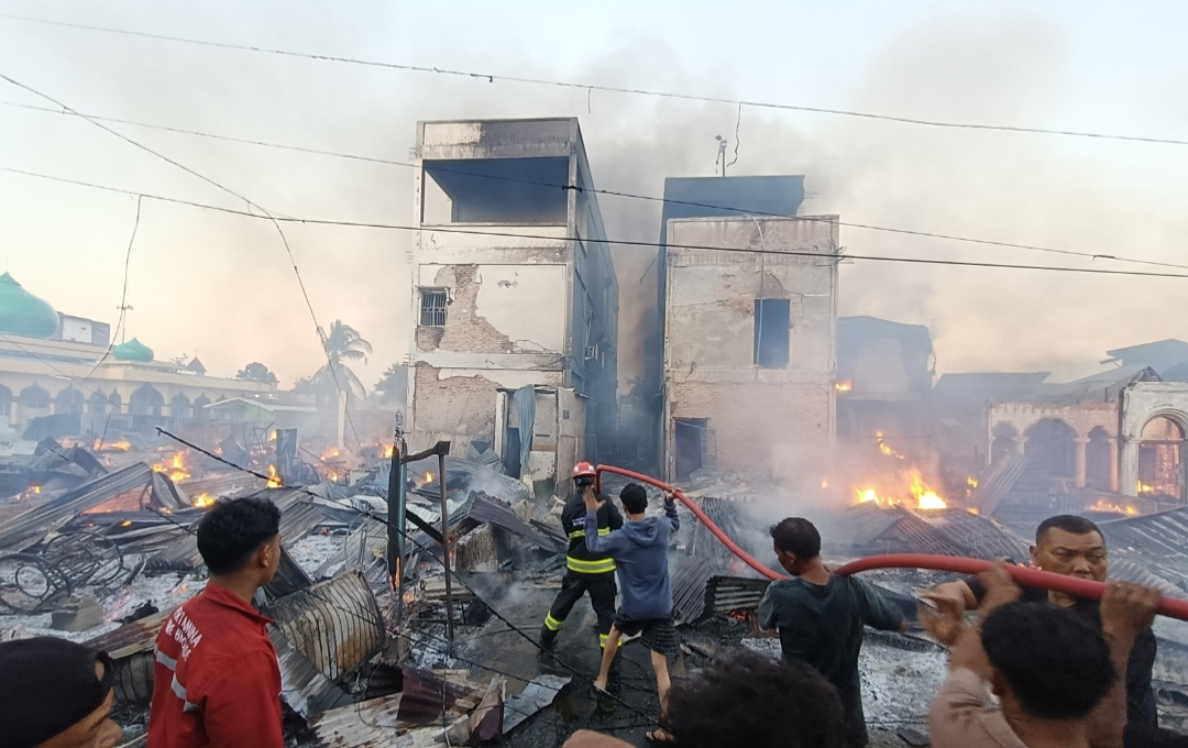 Pantauan media ini di lapangan, deretan bangunan yang terbakar membentang dari sisi kanan Masjid Raya Al Amin hingga sebelum Mushalla Muhammadiyah. Dua rumah ibadah itu nyaris ikut tersulut, namun beruntung hanya berjarak beberapa meter dari lokasi kejadian dan selamat dari amukan api.
