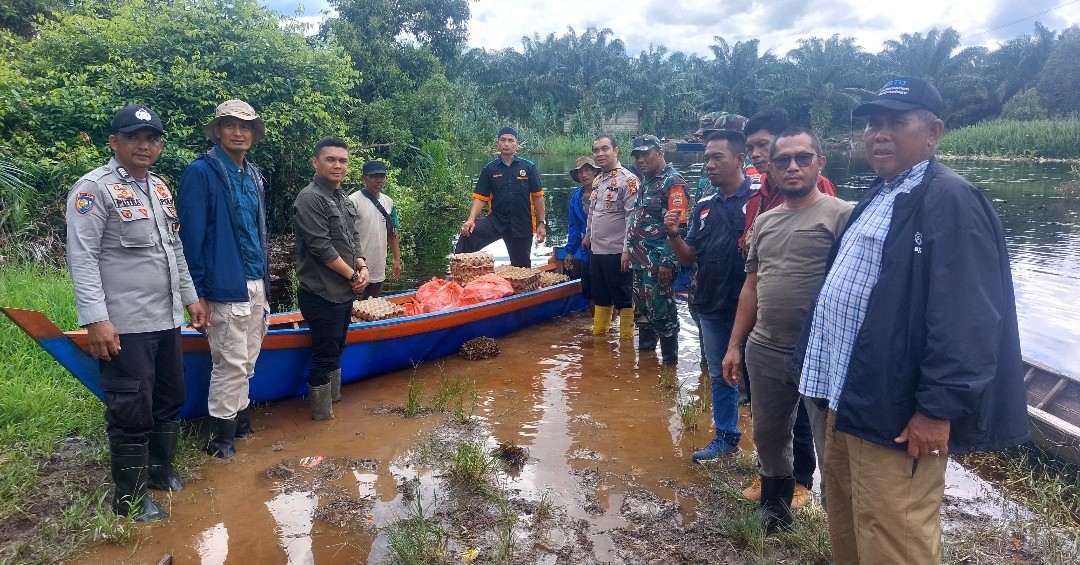 Keterangan Gambar : Penyaluran Paket Sembako dari Koperasi BBDM ke Desa Bandar Jaya Kecamatan Siak Kecil, oleh Kapolsek Siak Kecil dan Tim, Anggota DPRD Bengkalis Asep Setiawan, Anggota Koramil Bukit Batu, Pengurus FWBS dan sejumlah tokoh, Kamis (24/04/2025).