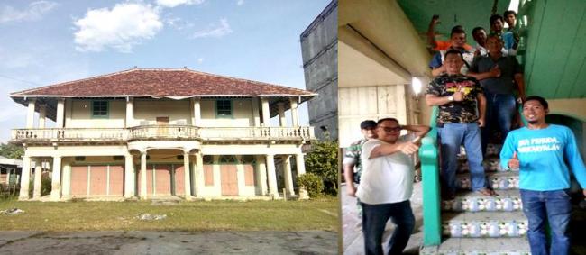 Keterangan Gambar : Rumah Peninggalan Kapiten di Sungai Pakning, Sekretaris Dispabudpora Kabupaten Bengkalis Nirmansyah dan sejumlah tokoh masyarakat memantau bangunan dalam rumah peninggalan kapiten