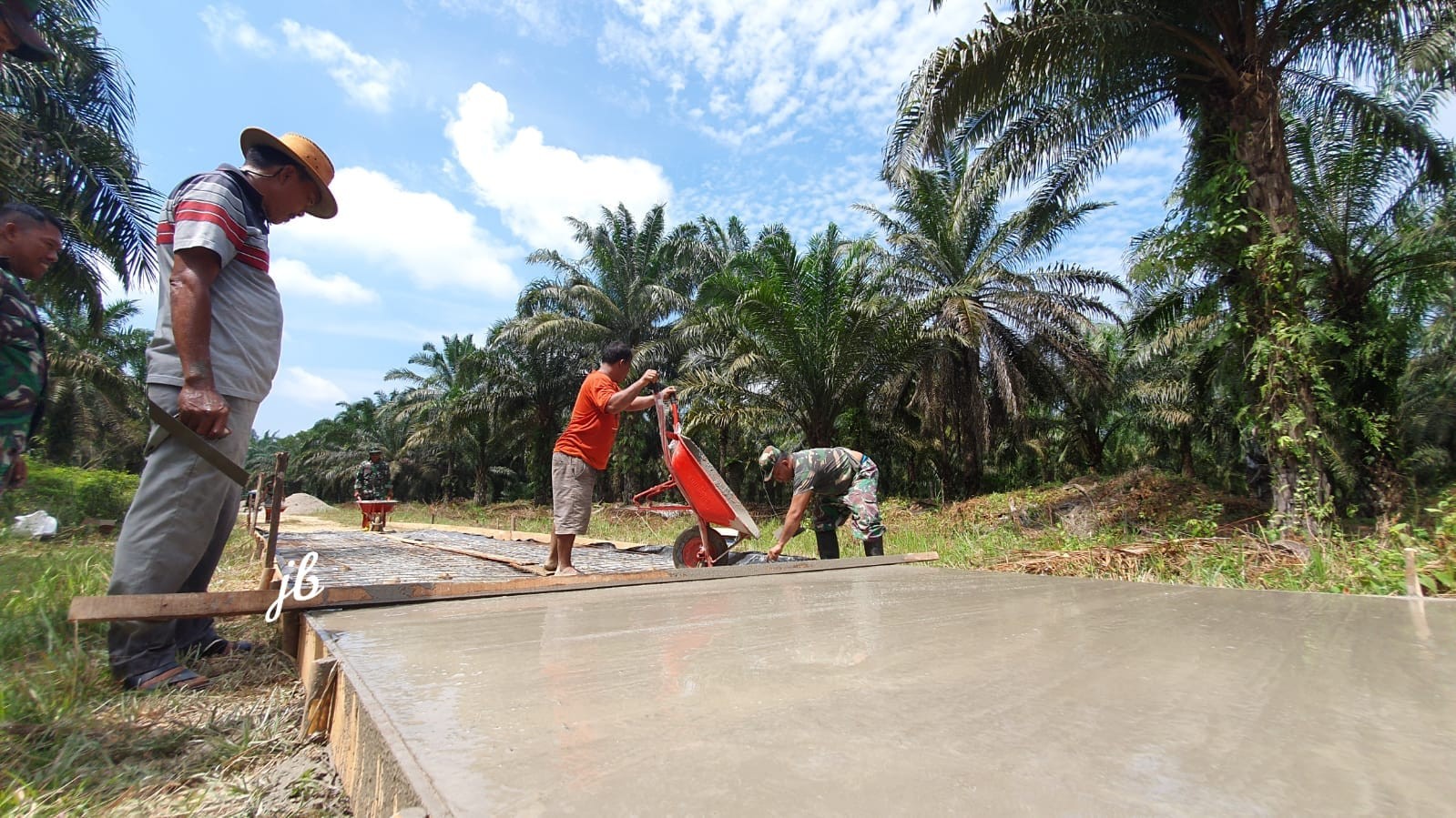 Diketahui, sinergitas Satuan Tugas TNI Manunggal Membangun Desa (Satgas TMMD) Kodim 0303 Bengkalis dibantu warga setempat terus membuat proses pengerjaan semenisasi jalan Sekolah di Dusun III Jaya Makmur Air Hitam, Desa Semunai kecamatan Pinggir.(Win)