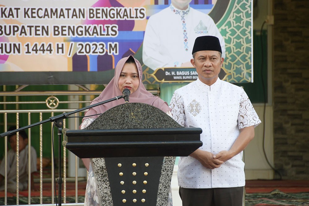 Keterangan Gambar : Bupati Kasmarni didampingi Wakil Bupati, H Bagus Santoso saat berpidato pada Safari Ramadhan di Masjid Al Falah Desa Senggoro, Bengkalis.