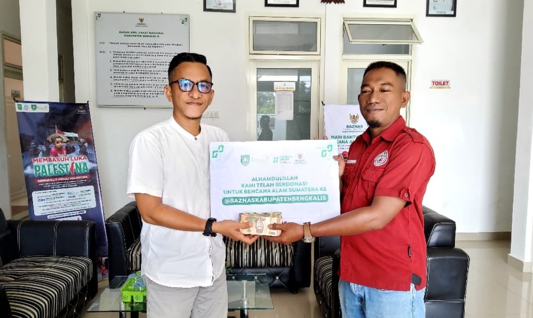 Keterangan Gambar : Penyerahan Donasi untuk korban bencana Sumatera dari Ketua UPZ Rumah Budaya Kacip Tembaga Erwin Syah Putra, Kepada Wakil Ketua I BAZNas Bengkalis Risman Hambali